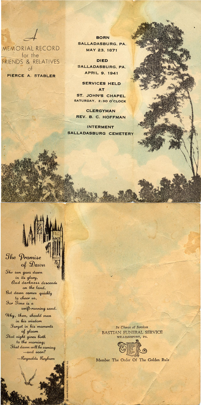 Funeral Card for Pierce Albert Stabler; born 23 May 1871 - died 9 April 1941. Original in the possesion of Kevin L. Sholder, his great-grandson when the scan was made on 13 August 2006. Original given to Kevin, by his grandfather Frederick Ulmer Stabler, son of Pierce.